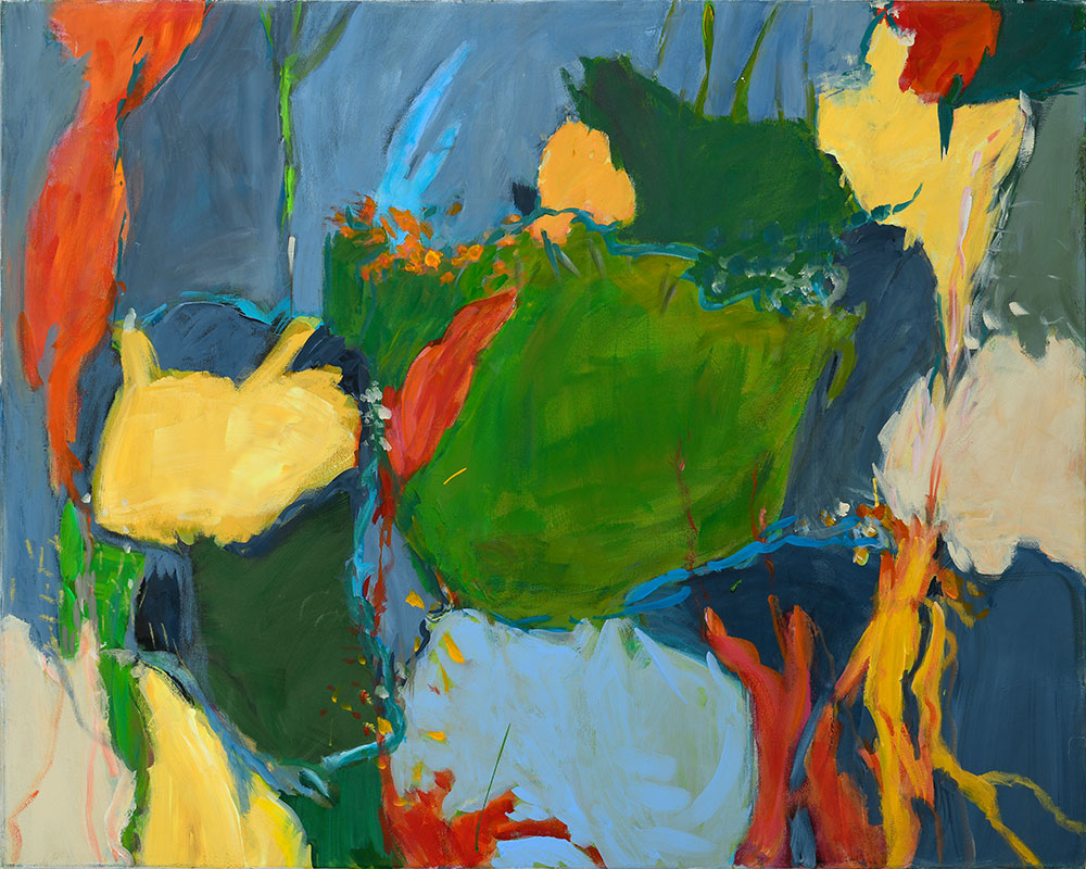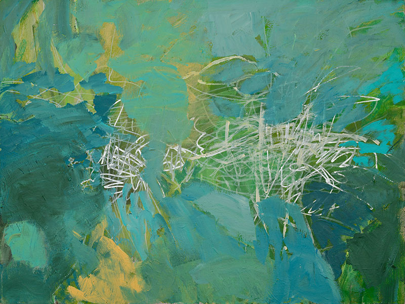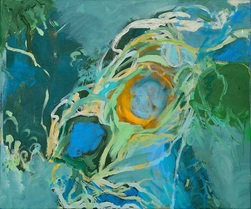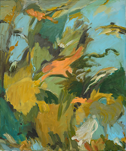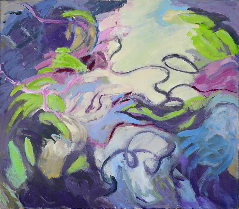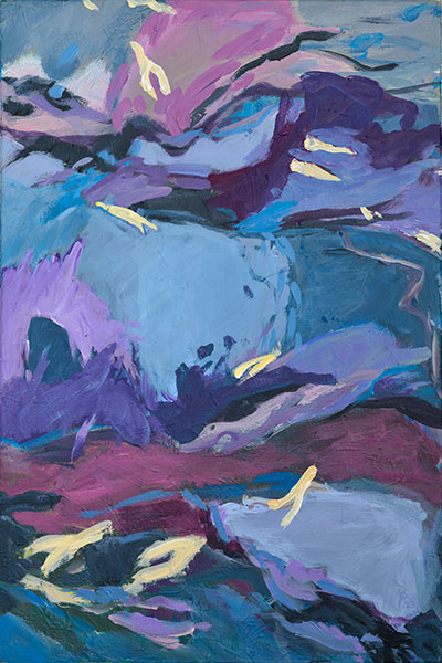 Auch ich denke an nichts, beginne mit einer Farbe, die mich gerade verlockt, füge andere dazu, mische, komponiere und schaue. Erst im fortgeschrittenen Malprozess, wenn schon Farbwelten entstanden sind, nehme ich Abstand und überlege, wie ich fortfahren soll. Manchmal ist das Bild dann schon fertig, hat sich sozusagen selbst gemalt. In anderen Fällen beginne ich zu reflektieren, wie ich das Vorhandene weiter gestalte, arbeite langsamer und kontrollierter. Fortwährend müssen neue Entscheidungen getroffen werden. Irgendwann fällt mir ein Titel für das Bild ein. Dann ist es vollendet. Oder das Bild spricht nicht mit mir, dann muss es vielleicht eine Zeit lang auf weitere Bearbeitung warten. Oder….